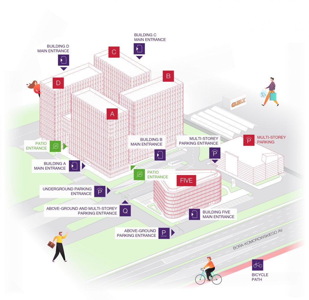 The Quattro building complex is located at Bora-Komorowskiego Av., one of the main communication arteries in Kraków. This allows you to get to your office fast regardless of the chosen means of transport. “Getting to the office” sounds cliché? Okay, then you will enjoy those excellent working conditions and afterwards you need no more than a 5-minute walk to do everyday things, such as shopping, arranging your home, picking up a parcel or visiting your doctor.